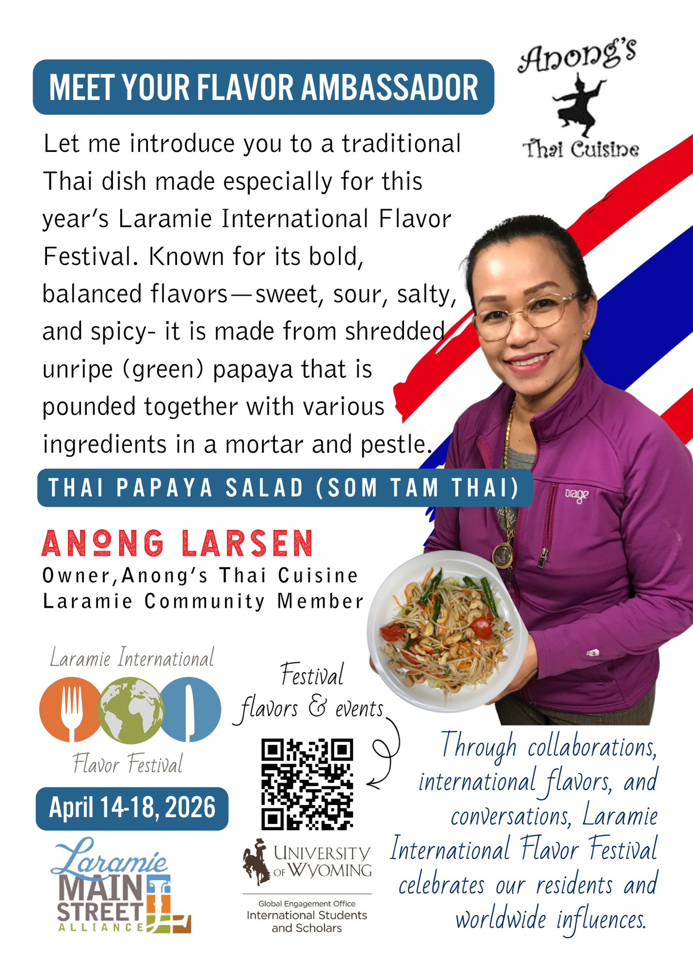 We offer som tam because its unique combination of spicy, sour, and fresh flavors reflects Thai cuisine and helps introduce the authentic taste of Thailand to foreigners.