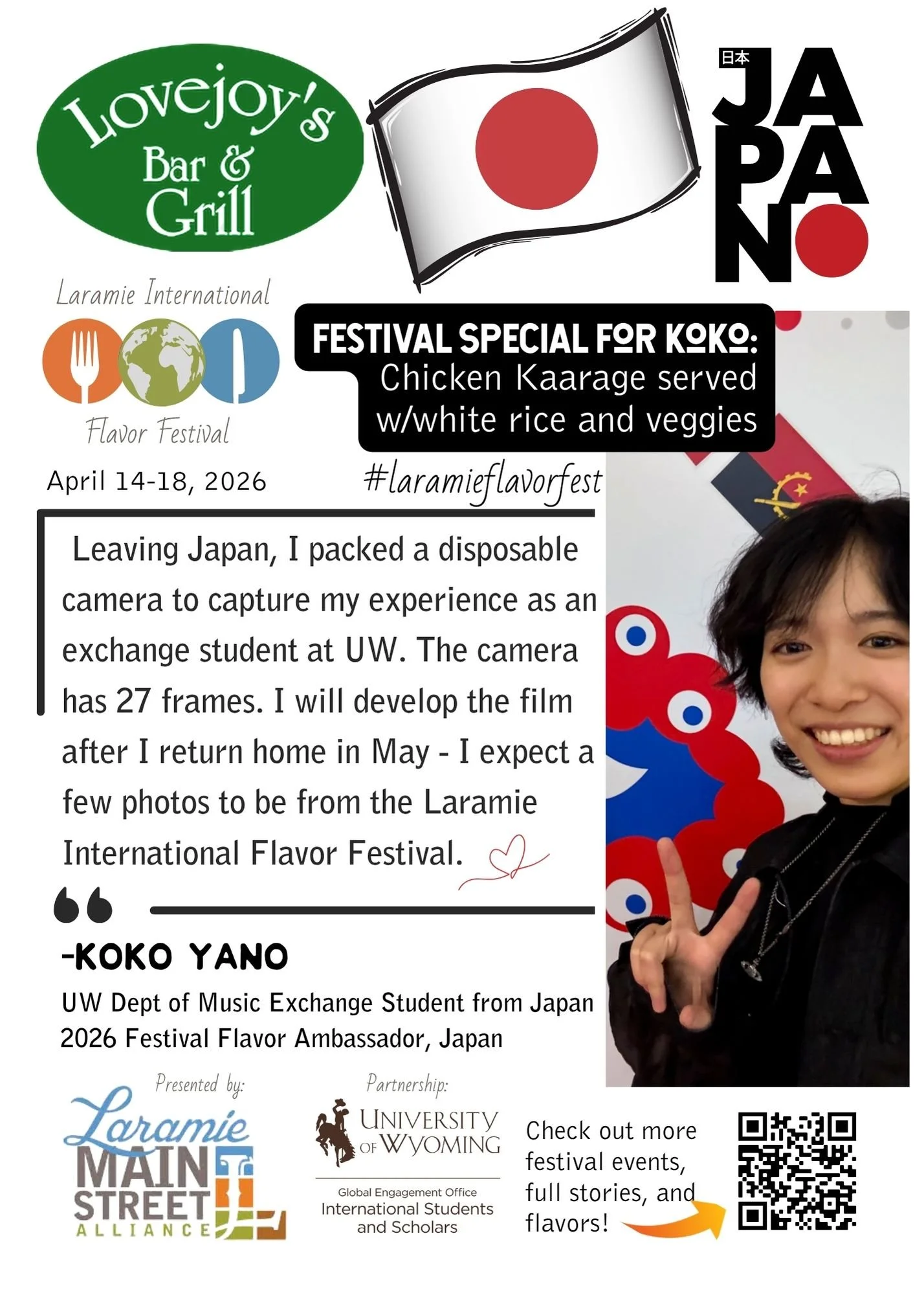 Leaving Japan, I packed a disposable camera to capture my experience as an exchange student at UW. The camera has 27 frames. I will develop the film after I return home in May - I expect a few photos to be from the Laramie International Flavor Festival.